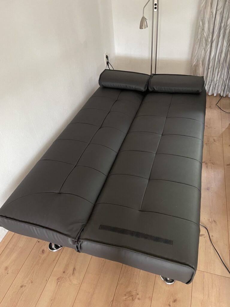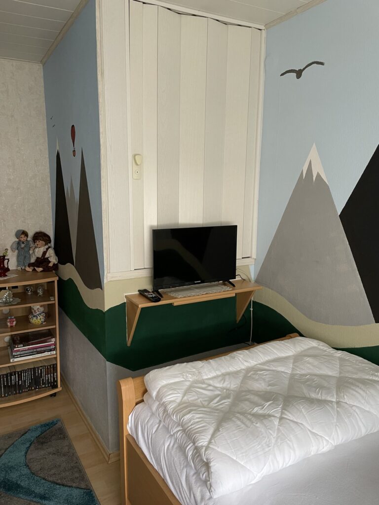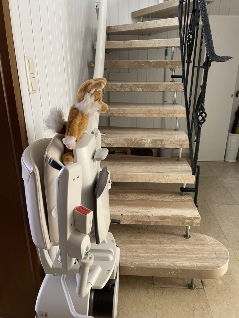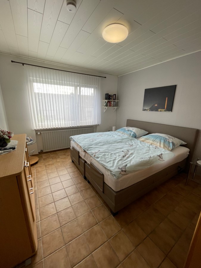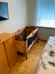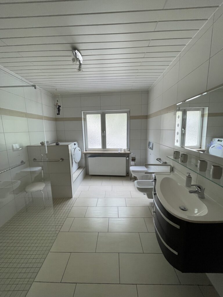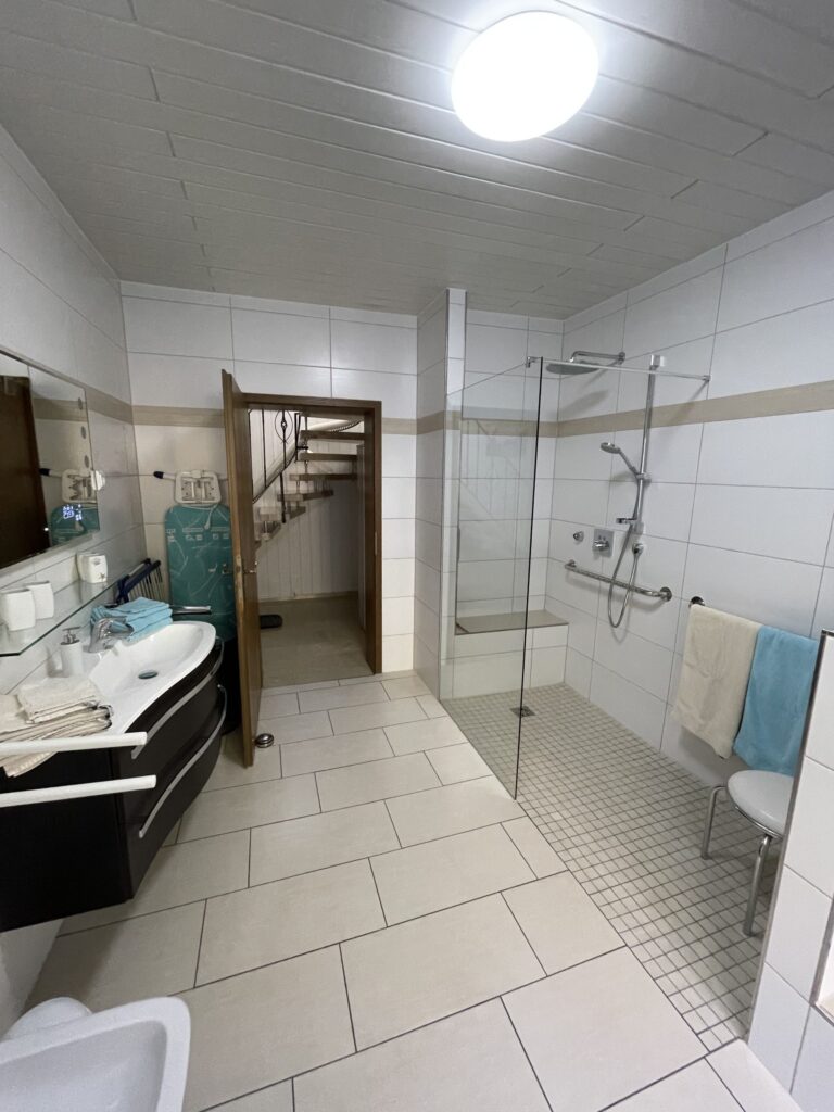 Im Erdgeschoß befindet sich das großes Badezimmer mit begehbarer Dusche , Waschmaschine und Trockner , sowie LED Spiegelschrank mit Bluetooth Anbindung zur Wiedergabe von Musik und Wetteranzeige für den aktuellen und nächsten Tag. Ein Fön, Bügeleisen und ein Bügelbrett sind ebenfalls vorhanden. Im Flur befindet sich ein Vorratsraum mit Staubsauger und allen Hilfsmitteln für die Reinigung des Hauses. Der im Flur befindliche Lifter kann gerne mitbenutzt werden. Hierfür erheben wir eine Kaution in Höhe von 250,00 EUR, welche selbstverständlich nach Ende des Urlaubs und ordnungsgemäßer Übergabe des Lifters zurückgezahlt wird. Das große Schlafzimmer beherbergt ein elektr. verstellbares Boxspringbett, ein Smart-TV , eine Kommode und einen großen Schrank. In diesem Zimmer kann auch das Kinderreisebett eingestellt werden. Das kleine Zimmer besitzt ein Smart-TV, Laptop Platz und ebenfalls ein elektr. verstellbares Bett.