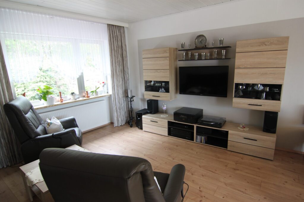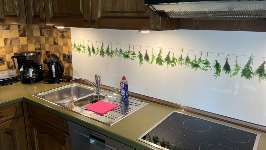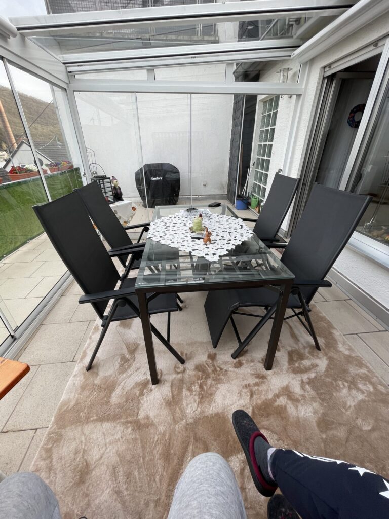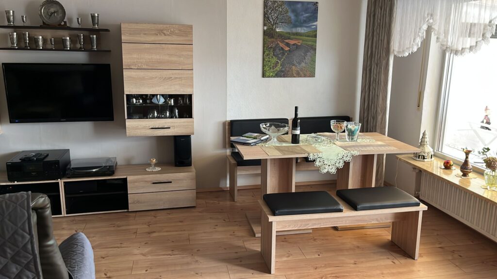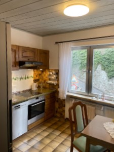 Unser Ferienhaus ist gemütlich und doch modern eingerichtet, Im Obergeschoß (für Menschen mit Beeinträchtigung in der Bewegungsfreiheit auch gerne mit dem eingebauten Lifter zu erreichen) befindet sich die Küche, die Gästetoilette und das große Wohnzimmer. Die Küche ist mit allem ausgestattet, was man für einen erholsamen Urlaub benötigt. Kühl/Gefrier-Kombination, Spülmaschine , E-Herd mit Backofen, Kaffeemaschine und Senseo-Maschine, Wasserkocher , Mixer und vieles mehr. Im Wohnzimmer befindet sich der große Smart-TV und eine Hifi-Anlage mit CD- und Plattenspieler (je ca. 100 CDs und Schallplatten sind vor Ort), vom Wohnzimmer aus gelangt man über den Wintergarten auf die Terrasse. Hier steht ein Gasgrill incl. voller Gasflasche und eine kleine Hifi-Anlage zur Unterhaltung zur Verfügung. Im Strandkorb kann man endspannen und die schöne Aussicht auf den Rhein und die Umgebung genießen. Ein großer Glastisch mit 4 Stühlen lädt zum Frühstück im Wintergarten ein. Für die kälteren Monate ist ein Infrarotstrahler installiert, der gerne benutzt werden darf. In der kleinen Gästetoilette ist ein Waschbecken vorhanden.