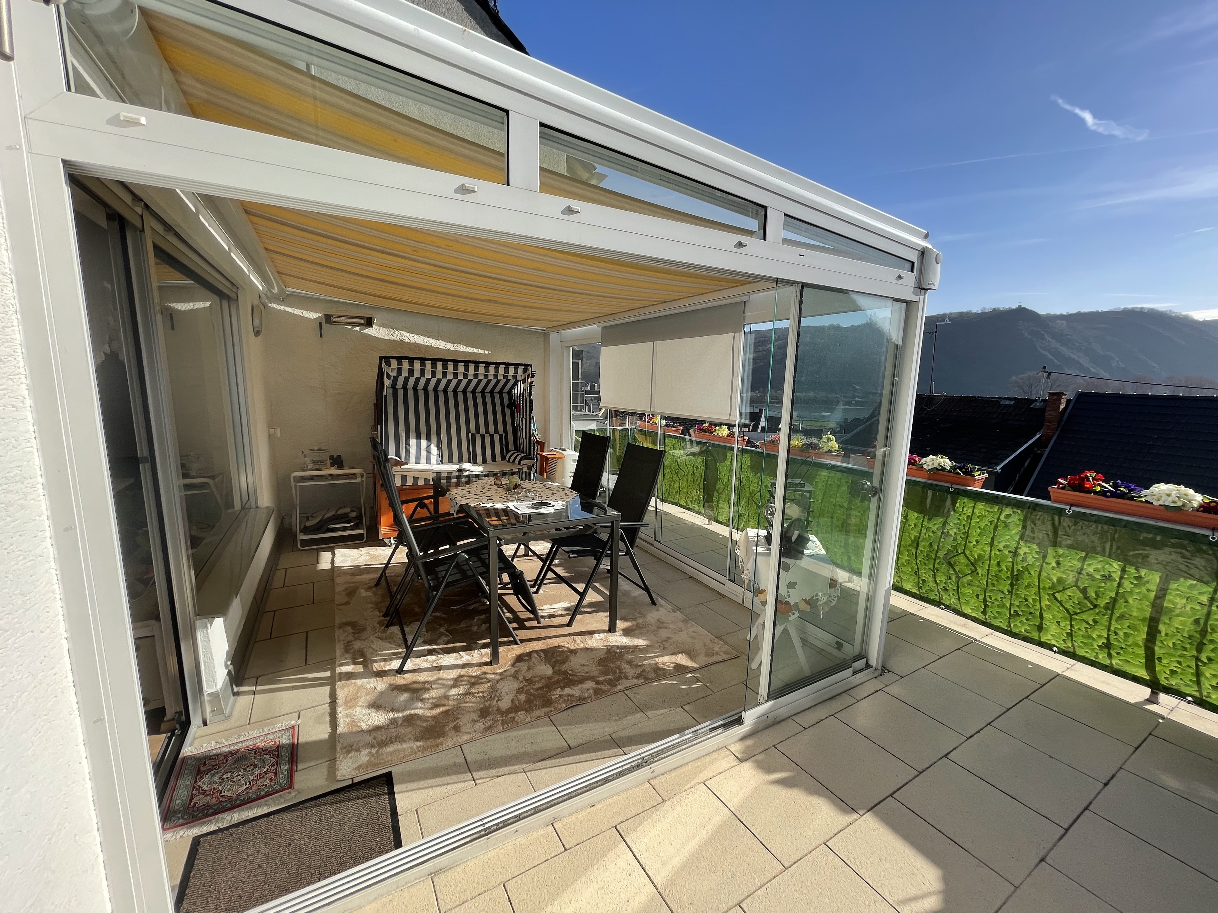 Genießen Sie lichtdurchflutete Räume und entspannte Stunden im Wintergarten. elektr. Sonnenmarkise und Infrarotstrahler für kühlere Tage vorhanden.