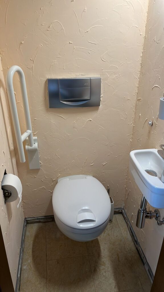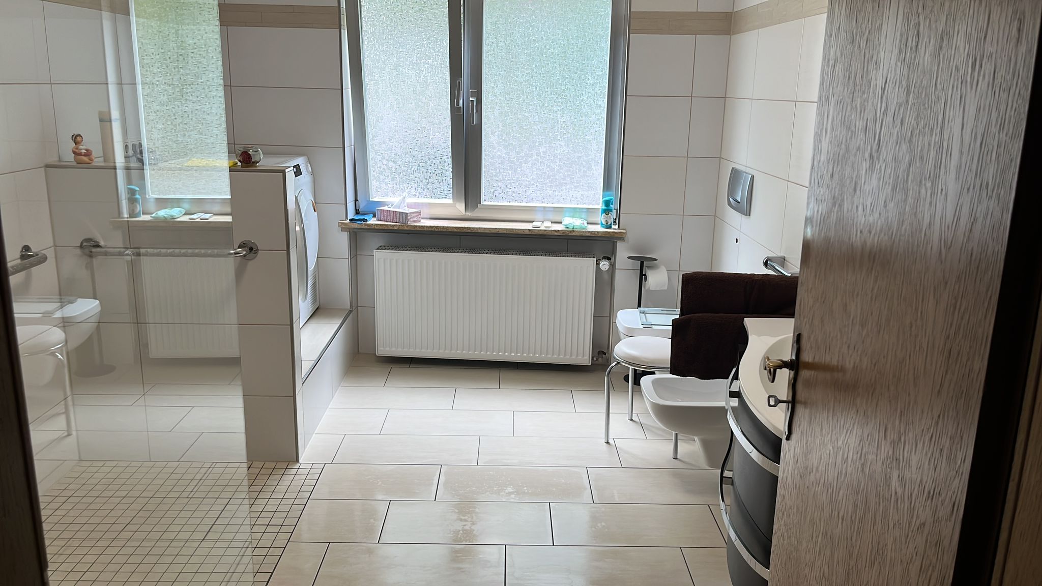 Ausgestattet mit einer großen begehbaren Dusche für höchsten Komfort, Waschbecken mit LES Spiegel und Bluetooth Anbindung, WC, Bidet , Waschmaschine und Trockn er
